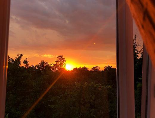 Widok z okna na sad, pokój jest spokojniejszy niż pozostałe.